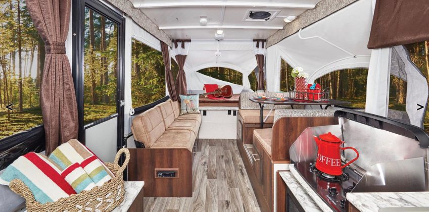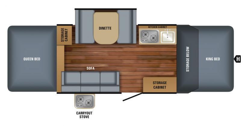 The Jay Sport offers a cozy appeal with soft, reversible dinette cushions and a bunk area with privacy curtains and optional 4” heated bed mats, bunk light and fan. The Jay Sport sleeps up to eight. Spacious dinette slide, jackknife sofa and shower/toilet combo are available. Residential cabinetry offers a taste of home. Beauflor vinyl flooring, indoor outdoor stove with wind deflector, hinged galley with fridge and storage access when the roof is closed. The water-repellent, sectionalized DuraTek tents feature a mildew resistant backer and tinted vinyl windows with cold crack coverage to 20 degrees. Optional is a exterior front black diamond plate storage box.