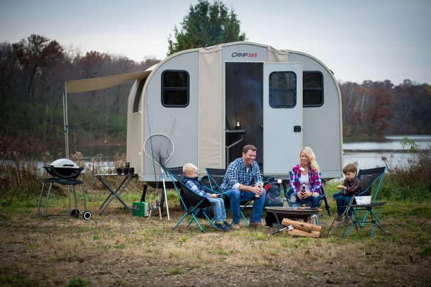Camp365, “The cabin that goes everywhere”, is light (just 1,490 to 1,800 pounds depending on options), it can be towed by virtually any vehicle and stored in a garage! With its patented leveling system, it sets up in just minutes, yet provides 700 cubic feet of living and storage space, enough to sleep 6 with its queen, twin or available bunk beds. Camp365’s proprietary dual-layer insulation system and Truma 12,500 BTU furnace, allows you to camp year-round. Camp365 also features twin-burner propane stove, modular sink, cassette toilet, dimmable LED lighting, and multiple USB ports for charging your electronics. Camp365 has an easily loadable side rack.