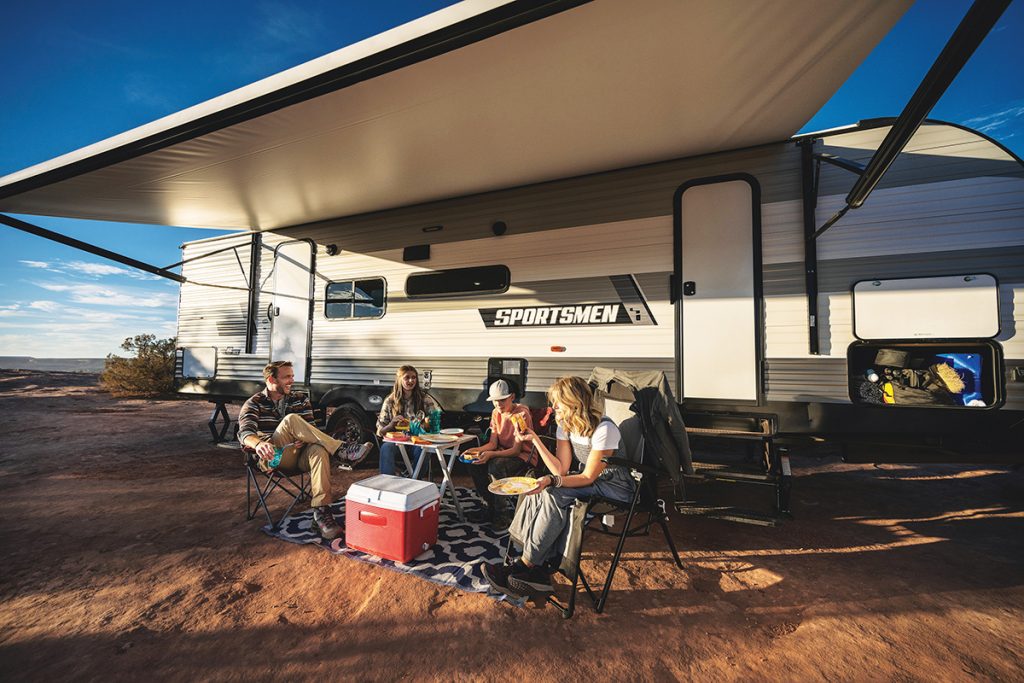 The Sportsmen SE travel trailers offer value and style, and include a power awning with LED lights, nitrogen-filled tires, spare tire and carrier, flip-up entry step, outside shower, I-PC Tufflex walk-on roof with 20-year warranty, drop-in cooktop with glass cover, jackknife sofa, seamless countertops, foot-flush toilet, multi-media Bluetooth soundbar with Advantage package, convenience package, A/C upgrade, 7 cu. ft. gas/electric refrigerator.