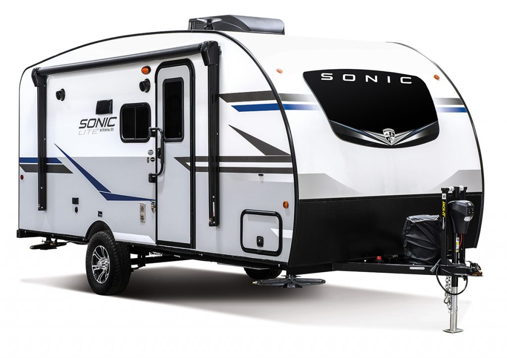 The 2021 Venture RV Sonic Lite is a 21’10” travel trailer in the Ultra Lite series, with single axle, solid construction and floorplans starting at just 3,000 pounds. Features include a one-piece fibreglass roof system, interior and exterior luxury packages, NXG frame, keyed-alike lock system, and solid flip-up step. Popular options include the “Blast” package 1.3, LevelMate Pro levelling system, spare tire and cover, TV with swing arm mount, swing-away bumper mounted griddle, and “off the grid” solar package.